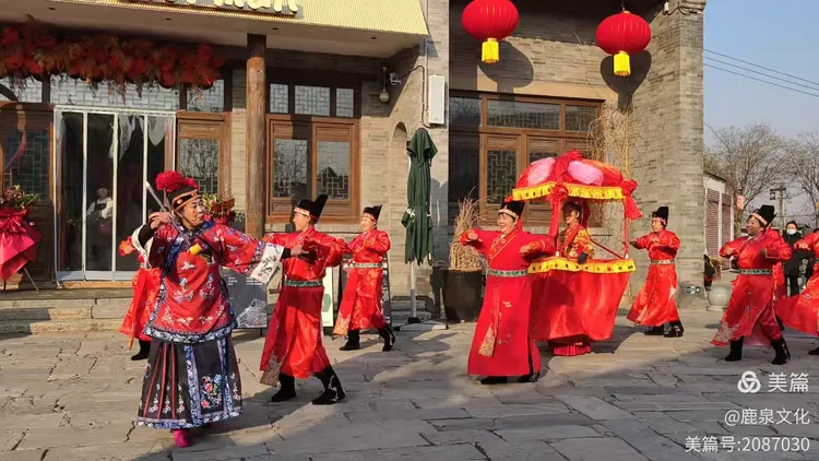 区级非遗抬花轿的演员身着传统婚服,抬着彩轿穿梭于人群中,生动再现了北方婚俗的热闹场景,将现场气氛推向高潮。