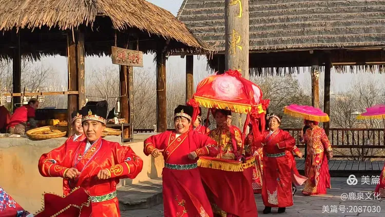 区级非遗抬花轿的演员身着传统婚服,抬着彩轿穿梭于人群中,生动再现了北方婚俗的热闹场景,将现场气氛推向高潮。